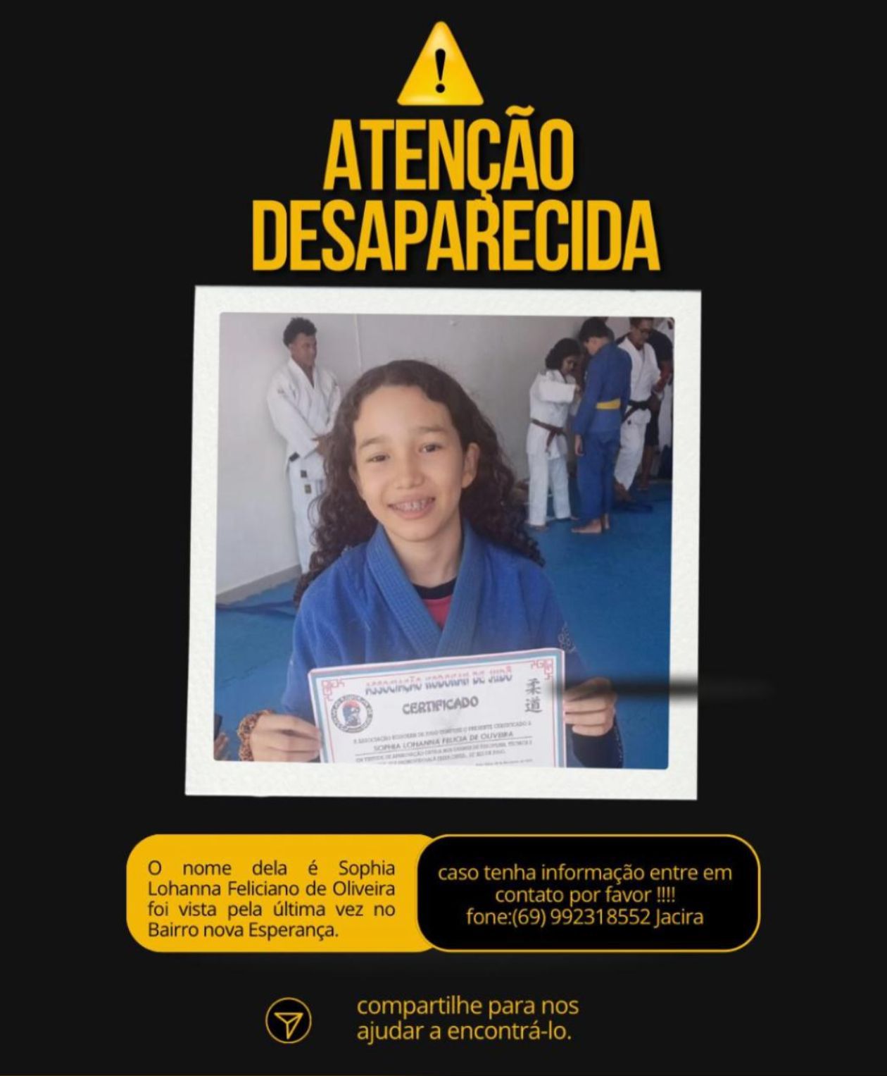 A menor Sophia Lohanna Feliciano de Oliveira, de 12 anos, está desaparecida.