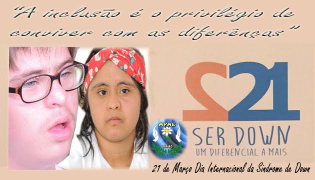 A Associação de Pais e Amigos dos Excepcionais-APAE Vilhena- lembra que amanhã, 21 de março é o Dia Internacional da Síndrome de Down, chamando a atenção da sociedade para a luta por direitos iguais, bem estar e inclusão das pessoas que nasceram com a síndrome. A data 21/03, ou 3/21 na grafia americana, faz referência aos três cromossomos número 21 que caracterizam esta ocorrência genética.