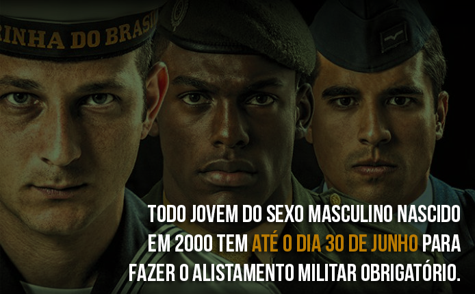 Neste ano, é a vez dos jovens que nasceram no ano 2000 se alistarem. Ou seja, todo brasileiro do sexo masculino que completar 18 anos é obrigado a se alistar pela internet ou então deve comparecer a uma Junta de Serviço Militar mais próxima da sua residência. O prazo máximo é até o dia 30 de junho.