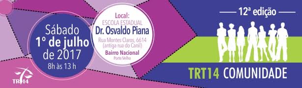 Exibindo TRT-Comunidade-615jpg JULHO.jpgO Tribunal Regional do Trabalho da 14ª Região, juntamente com seus parceiros institucionais, promove no próximo dia 1º de julho, das 8 às 13 horas, a 12ª edição do programa de responsabilidade social “TRT Comunidade”, na Escola Estadual dr. Osvaldo Piana, localizada na rua Montes Claros, 6614 (antiga  rua do Canil) no bairro Nacional em Porto Velho.