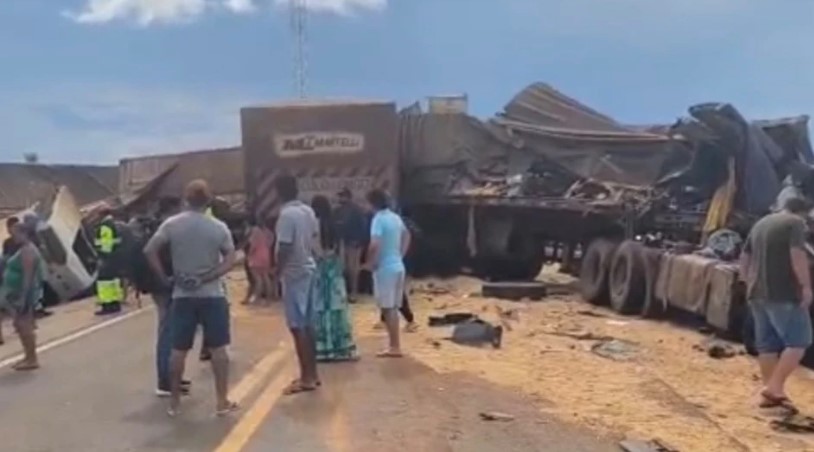 Imagens iniciais do local mostram a violência do impacto, com cabines completamente destruídas, veículos retorcidos e grande quantidade de destroços espalhados pela pista, evidenciando a gravidade da ocorrência.