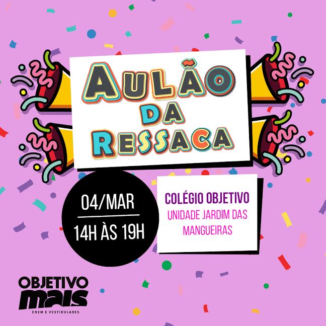Para quem busca se destacar no Enem e obter a aprovação nos vestibulares mais concorridos do país não existe feriado, o foco tem que ser 100% nos estudos. Por isso, o curso preparatório Objetivo Mais irá realizar o primeiro aulão do ano, para você não perder o foco e revisar os conteúdos que tem dúvidas. O ‘Aulão da Ressaca’ será no dia 4 de março, das 14h às 19h, no Colégio Objetivo – Unidade Jardim das Mangueiras.