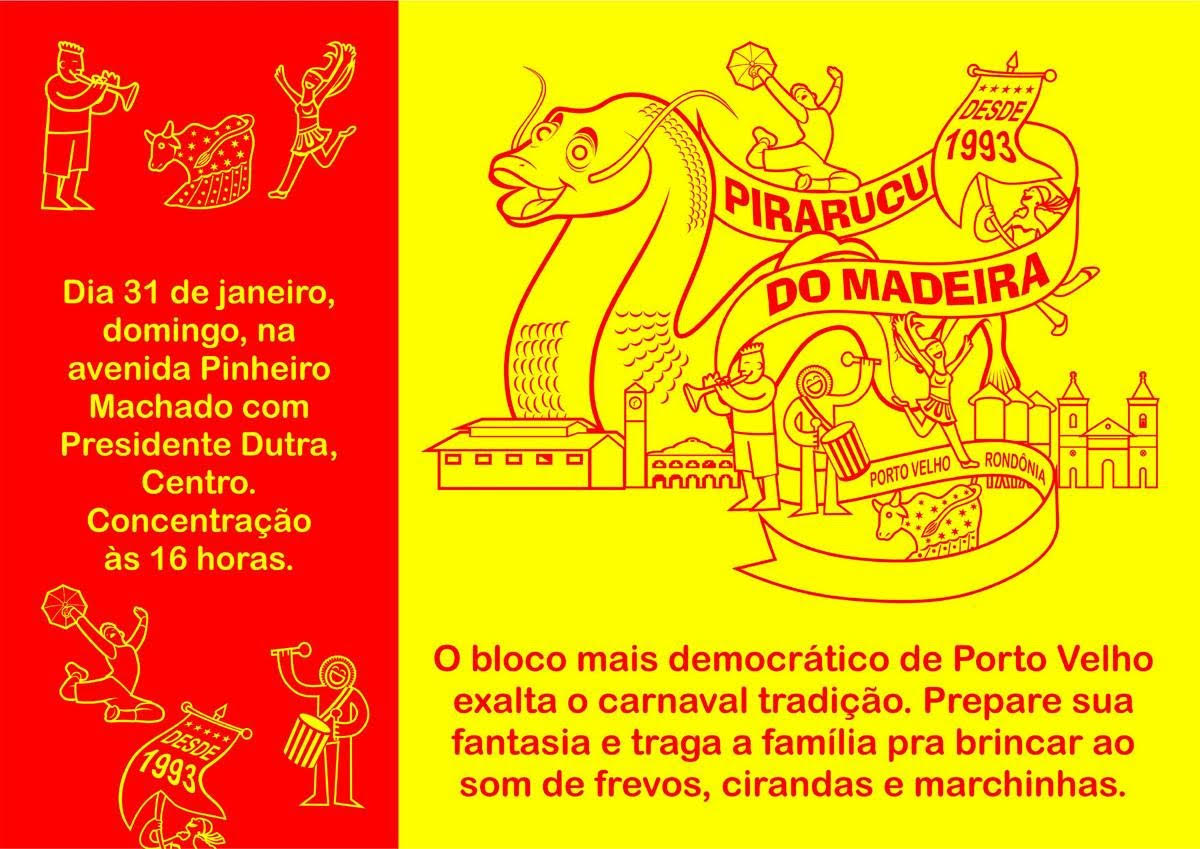 Será no dia 31 de janeiro com a concentração a partir das 16 horas, ao lado do ginásio Cláudio Coutinho, na Pinheiro Machado com a Presidente Dutra. O bloco fundado em 1993 pelo advogado Ernande Segismundo, mantido sem fins lucrativos, prega o carnaval de paz e a exaltação à cultura popular. “O Pirarucu desfila com a ajuda de amigos, muitos dirigentes de blocos ou simplesmente apoiadores da cultura popular. Não tem cordas, nem venda de camisetas, justamente para ser o mais independente e democrático possível.”, destaca Segismundo.