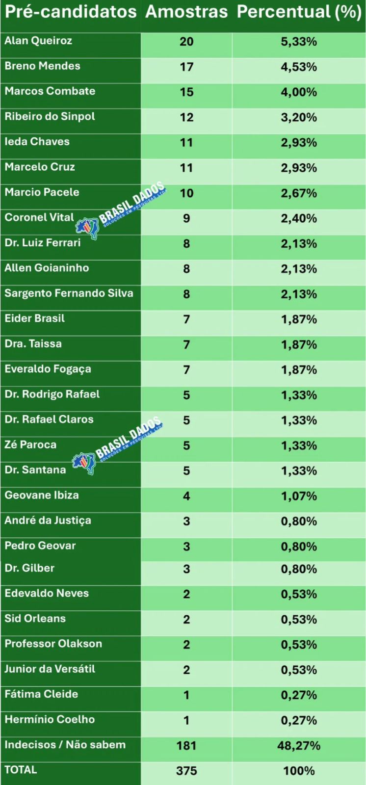 Além do trio de frente formado por Alan Queirós, Breno Mendes (4,53%) e Marcos Combate (4,00%), a pesquisa aponta que novos nomes começam a pontuar. Pedro Geovar e Dr. Gilber aparecem agora com 0,80% (3 amostras cada), empatando com André da Justiça.