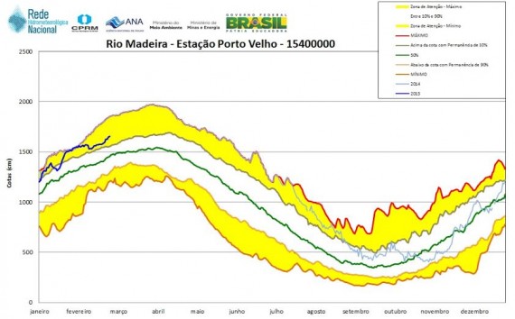Essa elevação da cota deverá permanecer em elevação até o final de março, possivelmente chegando a 16,70m ainda nas próximas 24 horas. No entanto, na região de Porto Velho estima-se que o nível ainda esteja dois metros abaixo em relação ao do ano passado, informou o engenheiro hidrólogo Franco Turco Buffon, da Companhia de Pesquisas de Recursos Minerais (Serviço Geológico do Brasil).