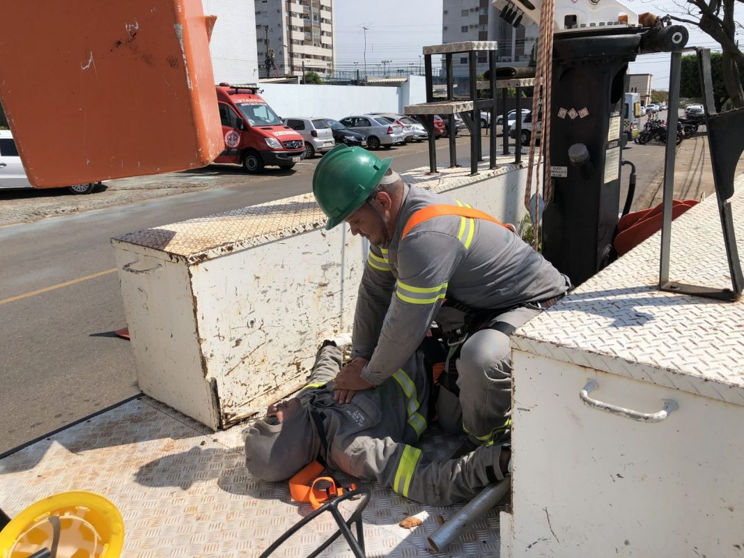 A ação aconteceu em frente ao prédio do MP, onde foi utilizado um poste para simular um choque elétrico durante a troca de lâmpada. Ao constatar o acidente, o trabalhador que fica no solo enquanto o companheiro executa o serviço no poste, retirou o colega do cesto para prestar os primeiros socorros até a chegada da ambulância.