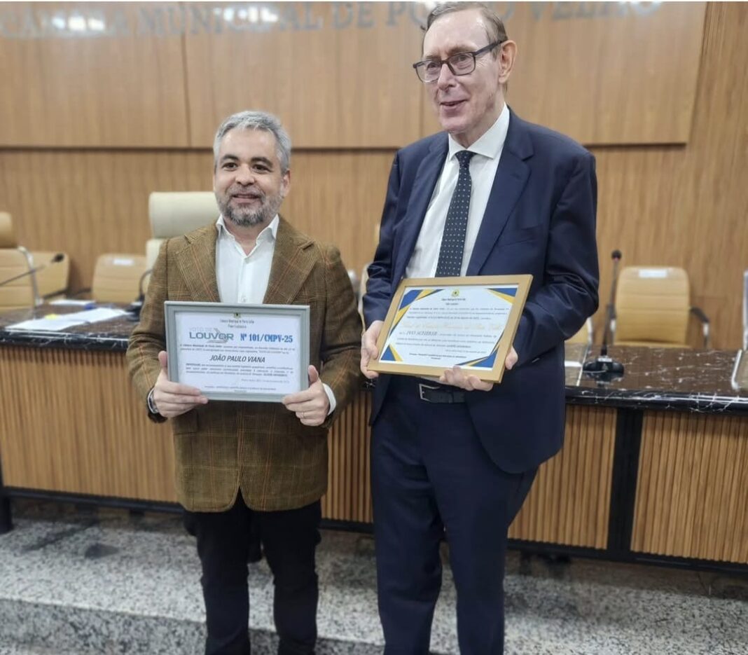Duas personagens icônicas de Porto Velho, cada uma em suas respectivas áreas, foram homenageadas semana passada. A Câmara Municipal de Porto Velho entregou o Título de Cidadão Honorário ao senhor Ivo Scherer e o Voto de Louvor ao professor João Paulo Viana, reconhecendo suas contribuições para o desenvolvimento social e acadêmico da nossa capital. “Uma honra ser homenageado pelo vereador Gedeão Negreiros, presidente da CMPV, juntamente com um dos mais notáveis homens públicos do nosso estado, o constitucionalista e ex-Procurador Geral de Justiça do MP-RO, Prof. Dr. Ivo Scherer“, disse JP Viana.