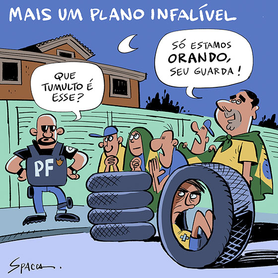 Surto paranoico e “uma certa confusão mental”. Essas foram as alegações do ex-presidente Jair Bolsonaro para explicar tentativa de abrir com um ferro de solda a tornozeleira eletrônica na madrugada de sábado, o que levou o ministro do Supremo Tribunal Federal Alexandre de Moraes a transferi-lo da prisão domiciliar para uma sala na Superintendência da Polícia Federal. Na audiência de custódia realizada por videoconferência neste domingo, Bolsonaro disse que pensou haver uma escuta na tornozeleira e que tentou abri-la, mas “recuperou a razão”. A defesa do ex-presidente apresentou um boletim médico afirmando que ele teve um “quadro de confusão mental e alucinações” associado ao remédio Pregabalina, embora ele não tenha sido prescrito pelos profissionais que atendem Bolsonaro. Ao fim da audiência, a juíza Luciana Yuki Fugishita manteve a prisão preventiva. (CNN Brasil)-Charge do Spacca
