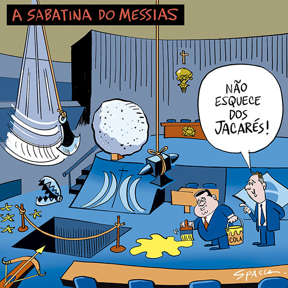 Com pouco tempo ou não, Messias está em campanha e, segundo levantamento do Poder360, ainda precisa conquistar mais três votos na CCJ, além dos 11 já prometidos, para ter a indicação aprovada. Dos demais integrantes da comissão, sete anunciaram voto contrário, três não responderam e seis não quiseram antecipar seu posicionamento. São necessários 14 votos (50%+1) na CCJ para que a indicação seja levada ao Plenário. (Poder360)- Charge do Spacca
