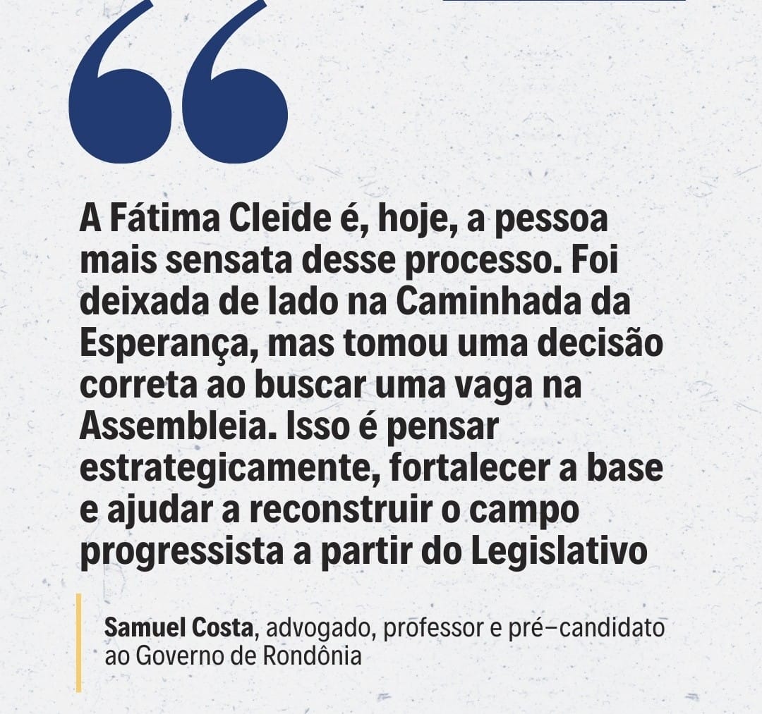 Samuel Costa considerou sensata a postura da ex-senadora Fátima Cleide (PT) que demonstrou maturidade política ao optar por disputar uma vaga na Assembleia Legislativa de Rondônia (ALE/RO). “A Fátima Cleide é, hoje, a pessoa mais sensata desse processo. Foi deixada de lado na Caminhada da Esperança, mas tomou uma decisão correta ao buscar uma vaga na Assembleia. Isso é pensar estrategicamente, fortalecer a base e ajudar a reconstruir o campo progressista a partir do Legislativo”, afirmou Costa.