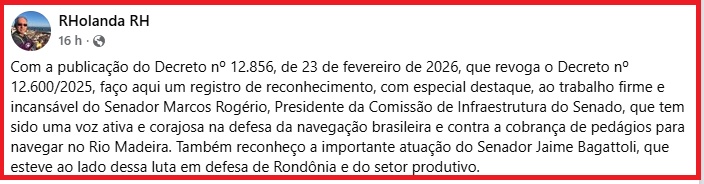 Como a direita adora inverter os fatos. Ontem, nas redes sociais, um empresário do setor de navegação em Rondônia e Amazonas, creditou a dois senadores, Marcos Rogério (PL-RO) e Jaime Bagatolli (PL-RO), a revogação do decreto que privatizaria os rios Madeira, Tapajós e Tocantins. Acontece que, na verdade, esse empresário acompanhou pari passu todas as tratativas para a privatização, inclusive apoiando. Participou em Brasília de debates em favor da concessão do rio Madeira à iniciativa privada, sob o pretexto de modernização do setor de transporte fluvial.