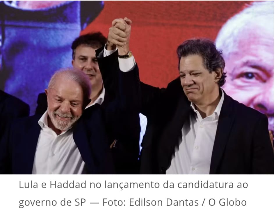 O PT anunciou a pré-candidatura do ministro da Fazenda, Fernando Haddad, ao governo de São Paulo, repetindo a estratégia adotada em 2022, quando o petista chegou ao segundo turno, mas foi derrotado pelo atual governador, Tarcísio de Freitas (Republicanos). A confirmação foi feita em evento no Sindicato dos Metalúrgicos do ABC, em São Bernardo do Campo, local simbólico para o partido e para o presidente Luiz Inácio Lula da Silva, onde teve início sua trajetória política. (Globo)