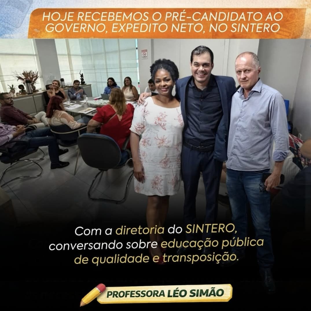 O pré-candidato ao governo de Rondônia pelo PT, Expedito Netto, está percorrendo o estado e sindicatos se apresentando. Deixou a Superintendência da Pesca para assumir de vez a pré-campanha. “Hoje tive a alegria de recepcionar a visita do pré-candidato ao Governo do Estado, Expedito Neto, no Sintero. Em um momento importante de conversa com a presidenta Dioneida da Castoldi, diretores e toda a equipe do sindicato, reforçamos pautas essenciais para o fortalecimento da educação pública. Acredito no diálogo com lideranças que têm um olhar sensível às necessidades do nosso povo, especialmente na defesa de uma educação de qualidade, transposição e no incentivo a ações sociais que transformam vidas. Seguimos firmes, construindo pontes e lutando por uma sociedade mais justa através da educação”, postou Léo Simão, do Sintero.