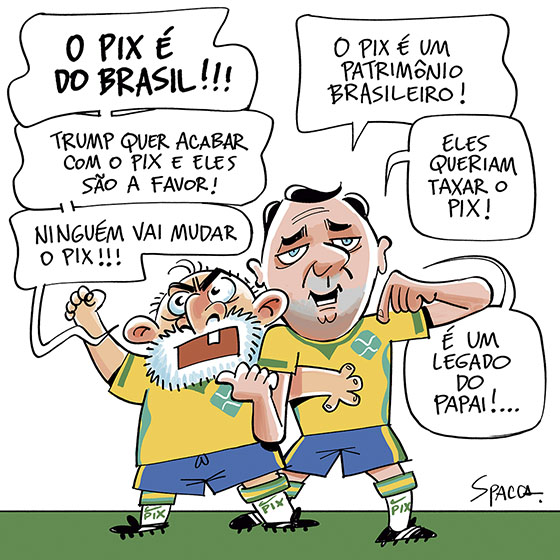 O ex-deputado Eduardo Bolsonaro e o deputado federal Nikolas Ferreira (PL-MG) protagonizaram um bate-boca nas redes sociais neste sábado, expondo fissuras na raiz do bolsonarismo. A briga teve início após um comentário irônico de Nikolas em uma publicação de Eduardo no X, que reagiu classificando o parlamentar mineiro como uma “versão caricata” de si mesmo. “Risinho de deboche para mim, @nikolas_dm?”, respondeu Eduardo. O estopim foi, ironicamente, um post de Nikolas em apoio a Jair Bolsonaro, em que compartilhou um vídeo do perfil Space Liberdade para reforçar a tese de que o Pix foi criado na gestão anterior, rebatendo falas de Lula. O problema? Horas antes, Eduardo havia declarado guerra aberta ao mesmo perfil, acusando-o de ser parte de uma ala da direita que trabalha contra o clã Bolsonaro. No desabafo, o filho do ex-presidente acusou Nikolas de desrespeito à sua família, de manipular algoritmos para conferir visibilidade a opositores e de não apoiar a campanha do irmão, Flávio. (Globo)- Charge Vai, Pix! do Spacca.
