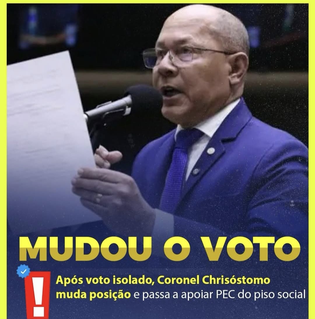 O sargento Pincel não engana ninguém. Mudou o voto porque é época de eleições. O deputado federal Coronel Chrisóstomo (PL) voltou atrás e passou a votar favorável à PEC que estabelece um piso mínimo de investimentos para ações sociais no Brasil, após inicialmente ter se posicionado contra a proposta. (Eu Ideal)