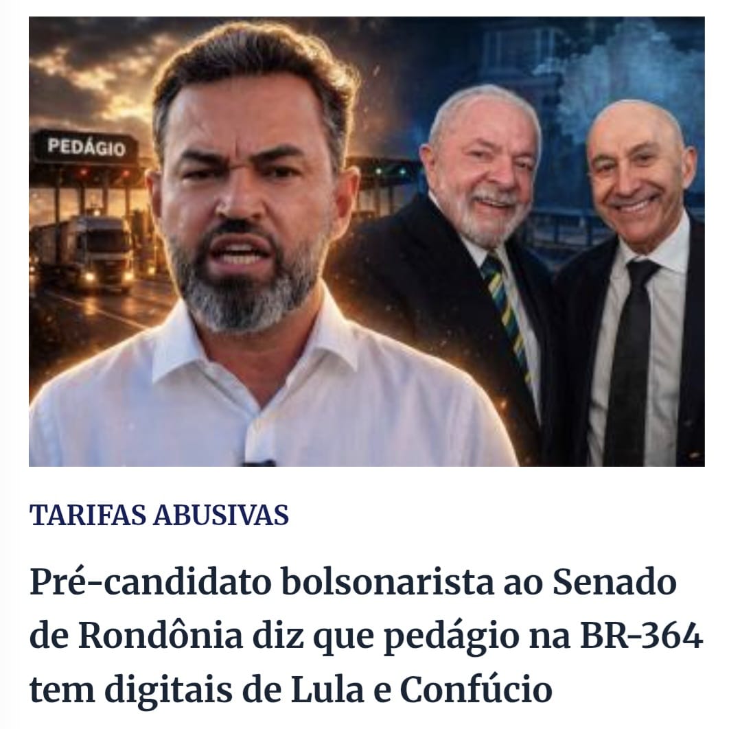O pré-candidato ao Senado Federal, Bruno Scheid (PL-RO), está creditando o pedágio da BR 364 à Lula e ao senador Confúcio Moura(MDB-RO). Que filho da….os estudos para a concessão da rodovia iniciou pelas mãos do ex-ministro dos Transportes, Tarcísio de Freitas (governo Bolsonaro), após audiências na Comissão de Infraestrutura do Senado Federal, com aval da bancada federal de Rondônia. Nada a ver com Lula, muito menos com Confúcio Moura. O senador está na luta para reduzir o valor do pedágio enquanto os outros parlamentares lavaram as mãos.