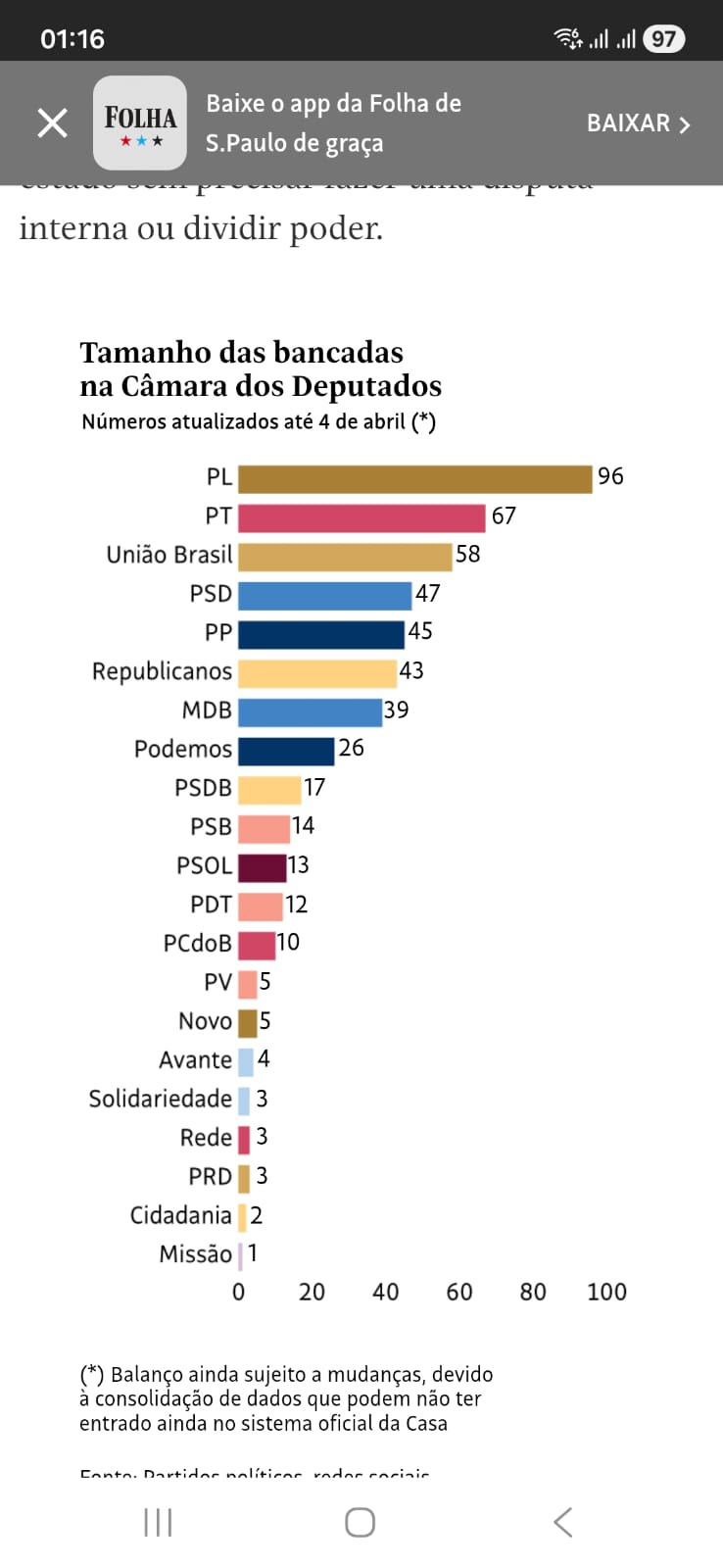 Individualmente, o PL é o partido com o maior número de deputados federais, 96. Em seguida vem o PT com 67. Mas a federação do União Brasil com Republicanos (UPr), somam 106 deputados, formando a maior bancada federal.