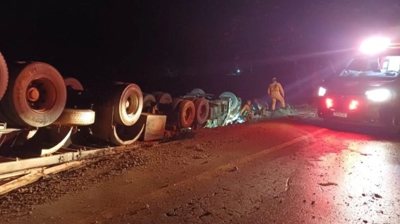 De acordo com o Centro de Comando e Controle Regional da PRF, uma carreta do tipo bi-trem, carregada com madeira, capotou no km 435,4 da rodovia por volta das 3h30. No veículo estavam cinco pessoas da mesma família.