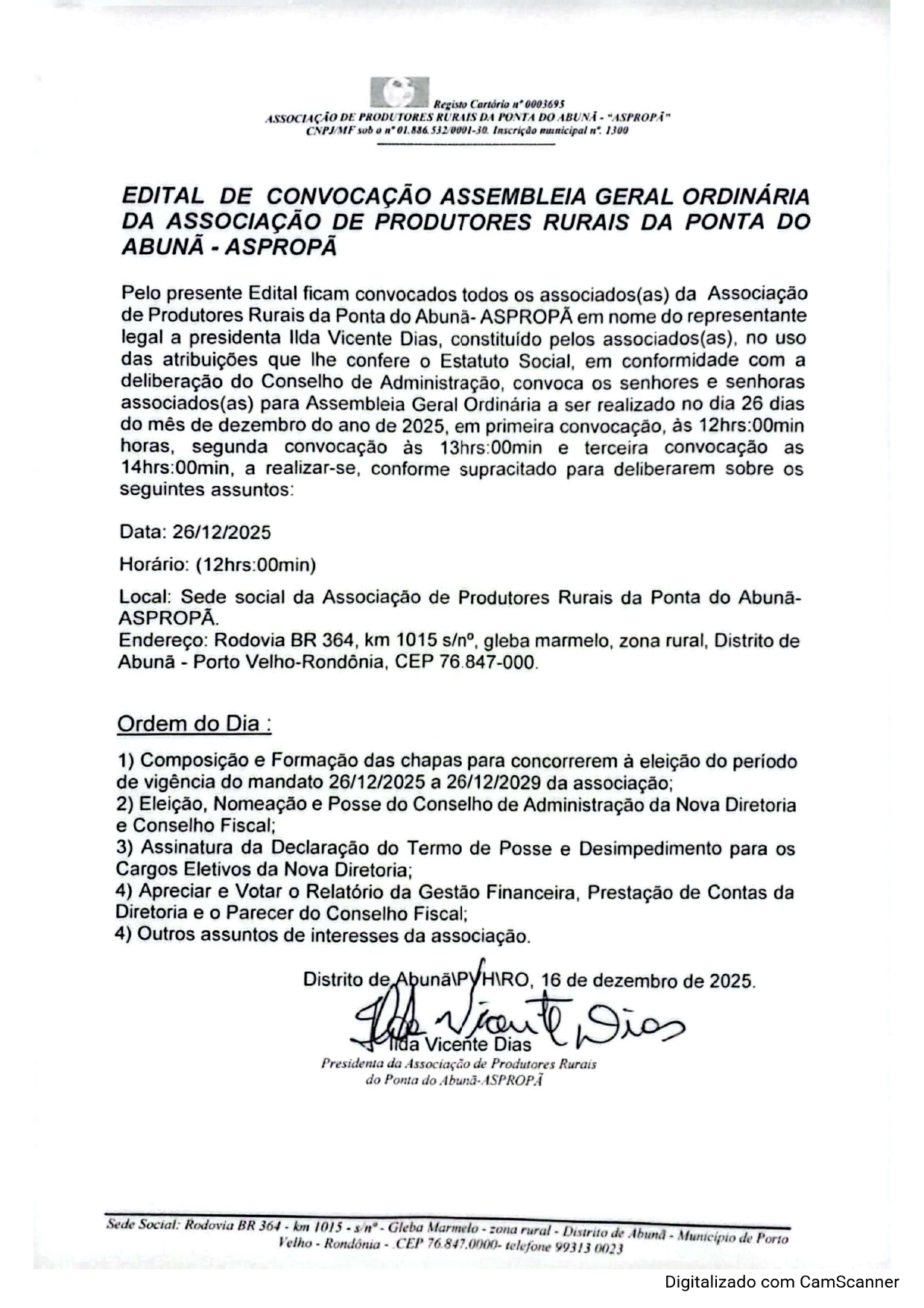 Pelo presente Edital ficam convocados todos os associados(as) da Associação de Produtores Rurais da Ponta do Abunã- ASPROPÃ em nome do representante legal a presidenta Ilda Vicente Dias, constituído pelos associados(as), no uso das atribuições que lhe confere o Estatuto Social, em conformidade com a deliberação do Conselho de Administração, convoca os senhores e senhoras associados(as) para Assembleia Geral Ordinária a ser realizado no dia 26 dias do mês de dezembro do ano de 2025, em primeira convocação, às 12hrs:00min horas, segunda convocação às 13hrs:00min e terceira convocação as 14hrs:00min, a realizar-se, conforme supracitado para deliberarem sobre os seguintes assuntos: