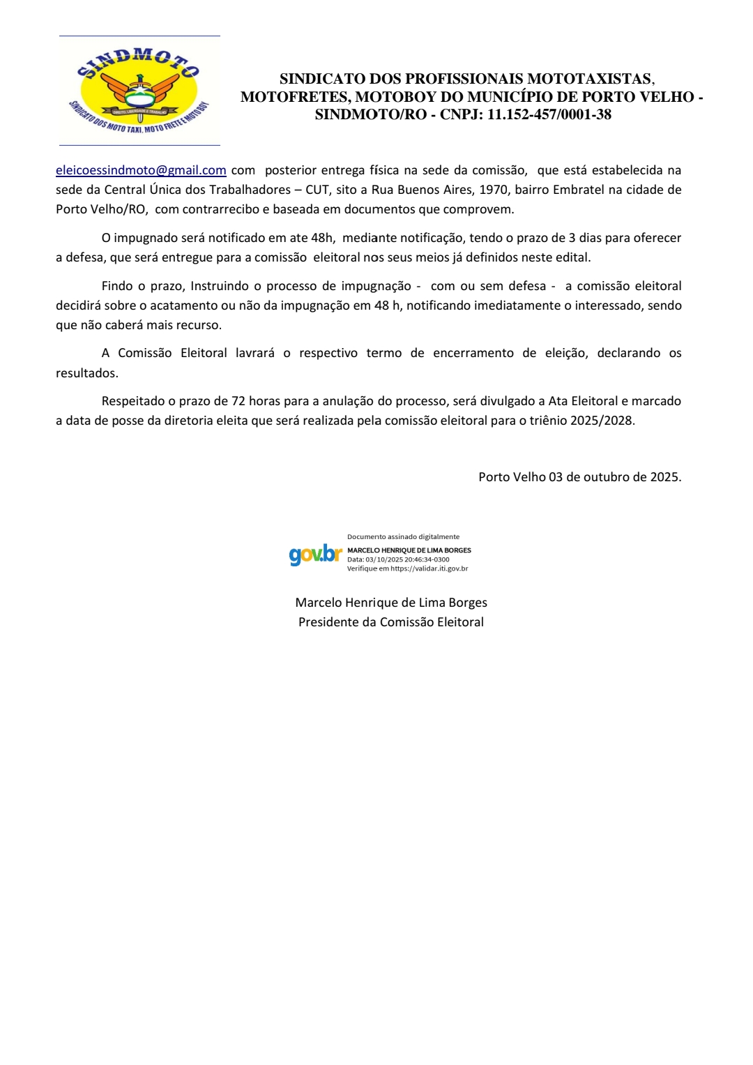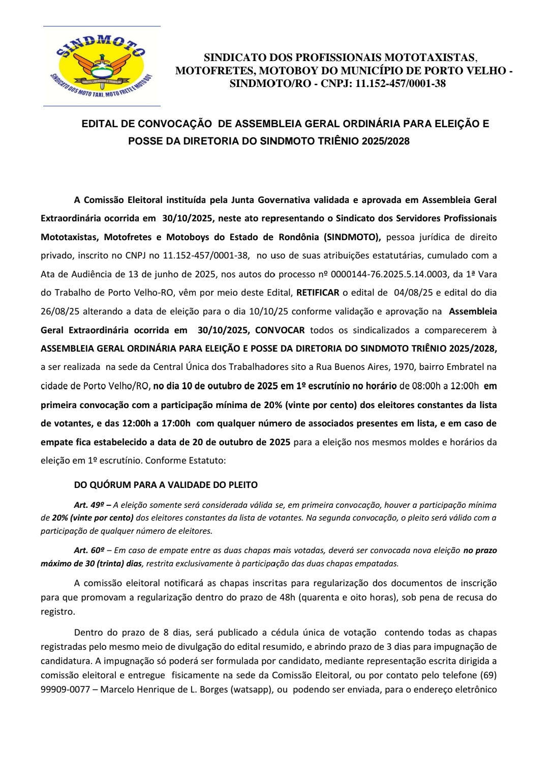 Edital de Convocação de Assembleia Geral Ordinária para Eleição e Posse da Diretoria do Sindmoto triênio 2025/2028