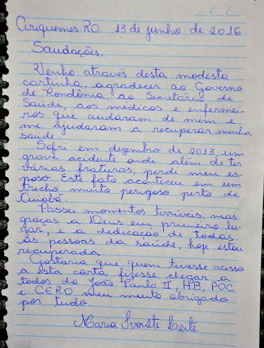 “O motivo desta carta”, diz Ivonete, “é uma forma bem simples, mas de coração, de agradecer a todas as pessoas que cuidaram de mim. E uma oportunidade de falar para as pessoas que não conhecem o “outro lado”, que nós, em Rondônia, estamos muito bem em se tratando de saúde de alta complexidade. Vivi um drama em Cuiabá, uma cidade grande, com muito mais tradição em medicina que Porto Velho. Fiquei exposta com várias pessoas doentes, adquiri uma infecção gravíssima, e graças à qualidade do serviço prestado pela Sesau, me recupere, e hoje estou bem, sem mutilação”.