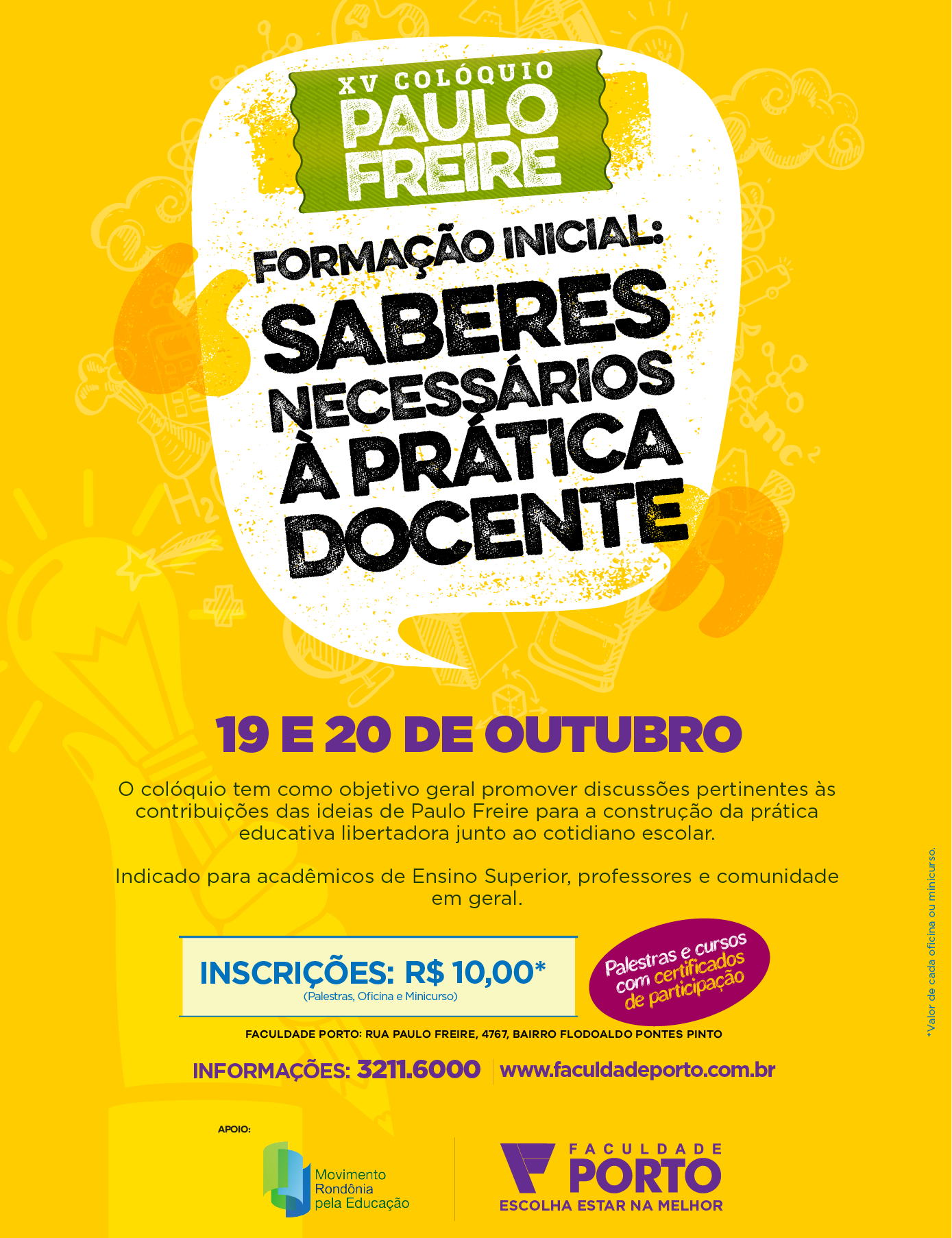 Paulo Freire foi um grande educador, filósofo e pedagogo brasileiro que foi considerado um dos pensadores mais notáveis da área educacional em nível mundial, sendo o Patrono da Educação Brasileira. Em virtude de suas práticas e pensamentos que colaboraram para um processo didático eficaz, a Faculdade Porto FGV, em parceria com o movimento Rondônia pela Educação, realizará nos dias 19 e 20 de outubro o XV Colóquio Paulo Freire, com o tema “Formação inicial: saberes necessários à prática docente”.