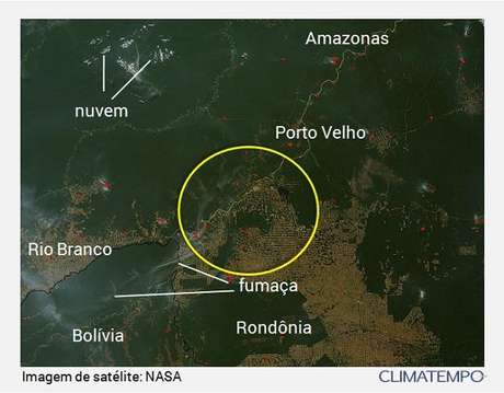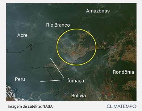 O satélite TERRA/MODIS, operado pela NASA, detectou vários focos de fogo no dia 4 de agosto na região de Rio Branco e de Porto Velho. Os focos de fogo são representados pelos pontos vermelhos. É possível ver também a pluma de fumaça saindo de focos mais intensos. A fumaça também pode ser vista como uma fina mancha acinzentada especialmente sobre Rio Branco.