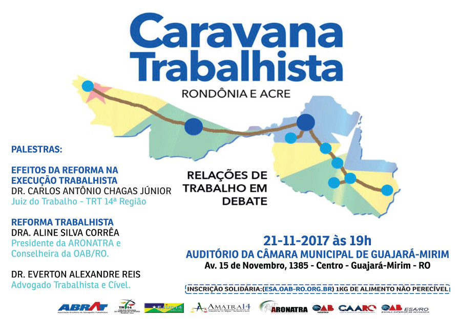 A Caravana Trabalhista (RO/AC) “Relações de Trabalho em Debate” leva debates sobre Reforma Trabalhista e seus efeitos na execução trabalhista a Guajará-Mirim (RO), nesta terça-feira (21/11), às 19h, no auditório da Câmara Municipal.