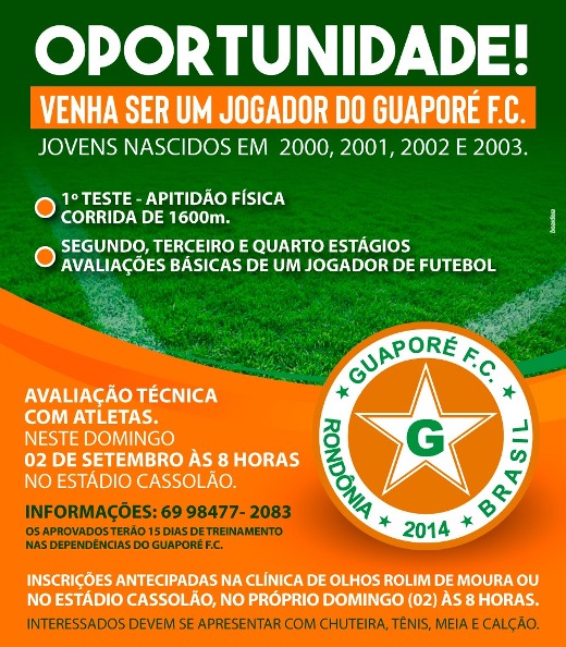 As inscrições são gratuitas e podem ser efetuadas na Clínica de Olhos Rolim de Moura ou mesmo no estádio Cassolão no dia do teste.