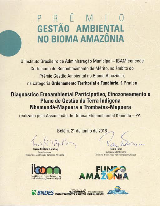 A Kanindé recebeu o certificado de reconhecimento de mérito do Instituto Brasileiro de Administração Municipal (IBAM) no Prêmio Gestão Ambiental no Bioma Amazônia. O projeto apresentado foi o Diagnóstico Etnoambiental Participativo, Etnozoneamento e Plano de Gestão da Terra Indígena Nhamudá-Mapuera e Trombetas-Mapuera, inscrito na categoria Ordenamento Territorial e Fundiário. A fundadora da Kanindé, Ivaneide Bandeira “Neidinha” fala sobre a importância do trabalho: “O diagnóstico do Mapuera é fundamental porque traz uma visão socioambiental da terra indígena com a garantia dos direitos do povo. Além disso, é importante porque o projeto também foi usado pela prefeitura no plano plurianual do município de Oriximiná, o que dá mais visibilidade para a etnia Wai-wai”.
