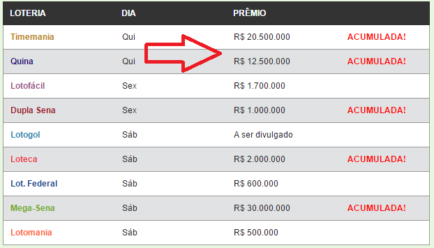 timemnia33Timemania e Quina acumuladas, pagam juntas, hoje, mais de R$ 33 milhões de reais! Saia do vermelho. A Timemnia pagará R$ 20,5 milhões para quem acertar as sete dezenas. Já a Quina, pagará R$ 12,5 milhões para quem acetar as cinco dezenas. Para jogar na Timemania a aposta é simples e custa R$ 2 reais, marcando 10 dezenas. Já na Quina, as apostas custam a partir de R$ 1,50. Você pode marcar de cinco a sete dezenas. E a Mega Sena acumulou de novo e a previsão para o próximo sábado é de R$ 30 milhões.
