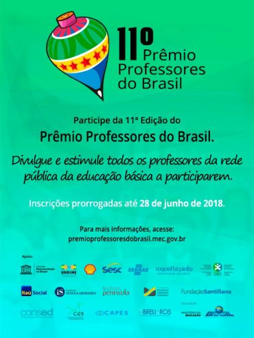 prazo das inscrições para a 11ª edição do Prêmio Professores do Brasil foi estendido para 28 de junho. O Prêmio Professores do Brasil é uma iniciativa do Ministério da Educação juntamente com instituições parceiras que busca reconhecer, divulgar e premiar o trabalho de professores de escolas públicas que contribuem para a melhoria dos processos de ensino e aprendizagem desenvolvidos nas salas de aula.
