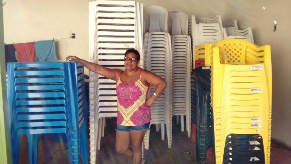 O casal também faz locação de mesas e cadeiras. O espaço da pequena empresa onde cabem cem pessoas tem piscina, churrasqueira e agora receberá nova pintura. Os aluguéis custam R$ 300, das 8h à meia-noite, e R$ 400 por 24 horas.