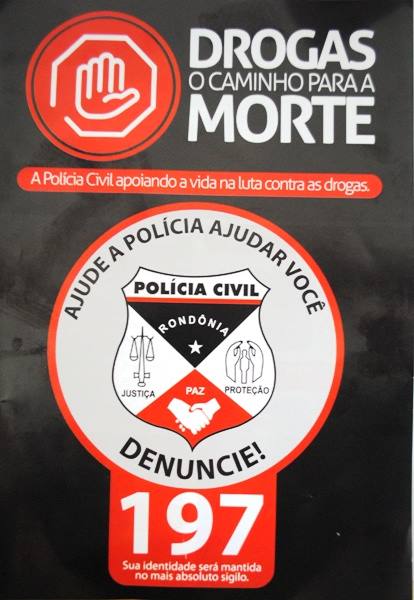De acordo com o Delegado-Geral da Polícia Civil, Eliseu Muller, o objetivo da Campanha é orientar à população quanto aos malefícios que o uso de drogas pode trazer para família e a sociedade, além de estimular a denúncia desta prática criminosa. “Com esta campanha estamos trabalhando preventivamente com o cidadão e cumprindo nosso papel social, estreitando a relação com o público, fortalecendo a confiança entre a Instituição Polícia Civil e à população do Estado de Rondônia com objetivo de orientar, tirar dúvidas e prestar esclarecimentos de como o cidadão deve realizar denuncias de quaisquer prática criminosa utilizando o número 197 disponibilizado pela Polícia Civil”, explica Eliseu.