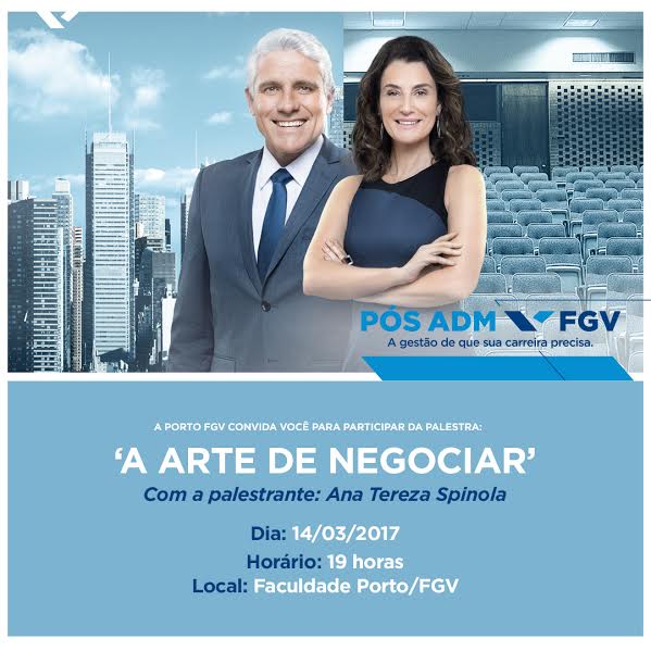 Atenta a isso, a Faculdade Porto FGV realizará a palestra “A Arte de Negociar” cuja proposta é discutir e apresentar formas de alcançar acordos levando em consideração todas as diferenças, culturas e formas de negociar presentes em diversos tipos de organizações. As inscrições são gratuitas e podem se feitas pela internet, através do site http://bit.ly/AArteDeNegociar.