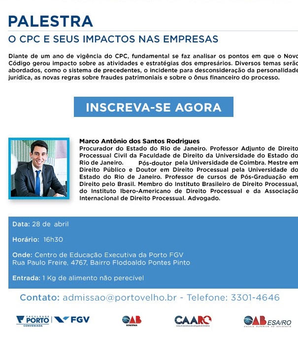 O novo Código de Processo Civil (CPC) está em vigor há um ano e, por isso, ainda é um texto bastante recente na área jurídica. O documento normatiza processos judiciais em diversas áreas e, para falar sobre os impactos que o novo CPC teve nas atividades e nas estratégias empresariais, a Porto FGV realizará a palestra “O CPC e seus impactos nas empresas”, ministrada pelo procurador do Estado do Rio de Janeiro e professor da FGV, Marco Antônio dos Santos Rodrigues.