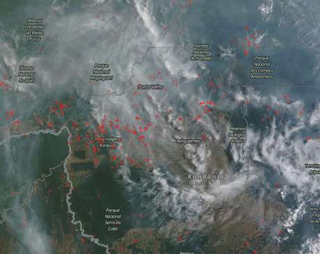Na imagem a seguir é possível ver a imagem gerada pelo satélite Terra Modis das 11h50 (horário de Brasília) do dia 10 de setembro de 2016. As áreas esbranquiçadas indicam a presença de fumaça. Os pontos vermelhos no mapa indicam os focos de queimadas detectados pelos dois satélites Modis (Terra e Aqua).