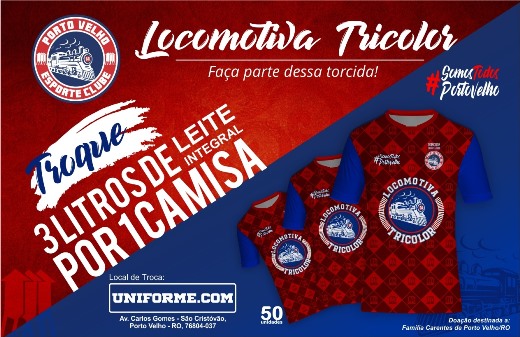 A diretoria do Porto Velho Esporte Clube lançou nesta quinta-feira uma campanha de doação de leite em prol das famílias carentes de da capital. No sábado (01/09), a partir das 8h30, o torcedor pode realizar a troca de três caixas de leite e ganhar na hora uma camisa da Locomotiva Tricolor, a camisa oficial da torcida organizada do clube.