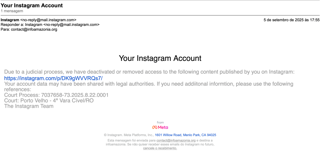 O Instagram removeu do ar, no Brasil, uma publicação da InfoAmazonia sobre uma investigação jornalística envolvendo o secretário-adjunto de Desenvolvimento Ambiental de Rondônia, Gilmar Oliveira de Souza. A decisão cita um processo iniciado na 4ª Vara Cível de Porto Velho (RO), mas do qual a InfoAmazonia não foi citada nem intimada. A plataforma, que comunicou à organização a retirada do conteúdo em 5 de setembro, apenas informou que a restrição decorre de ordem judicial.