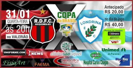 O Real Ariquemes recebe na quarta-feira, a partir das 20 horas (horário de Rondônia), o Londrina-PR no estádio Gentil Valério, em Ariquemes, pelo jogo único da primeira fase da Copa do Brasil 2018. O vencedor do duelo encara o ganhador do jogo entre Brusque-SC x Ceará-CE.
