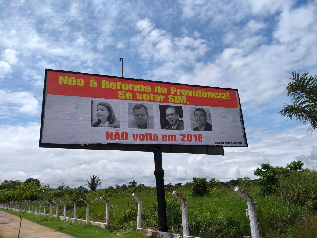 PORTO VELHO- A capital de Rondônia amanheceu hoje com dezenas de out doors espalhados nas principais vias com um recado direto à bancada federal. Só um deputado, Expedito Neto (PSD), que votou contra a reforma Trabalhista, afirmou que não vai votar sim pela reforma da Previdência. Os movimentos sociais e sindicais vão manter a campanha pra barrar a reforma da previdência e outros retrocessos do governo golpista.