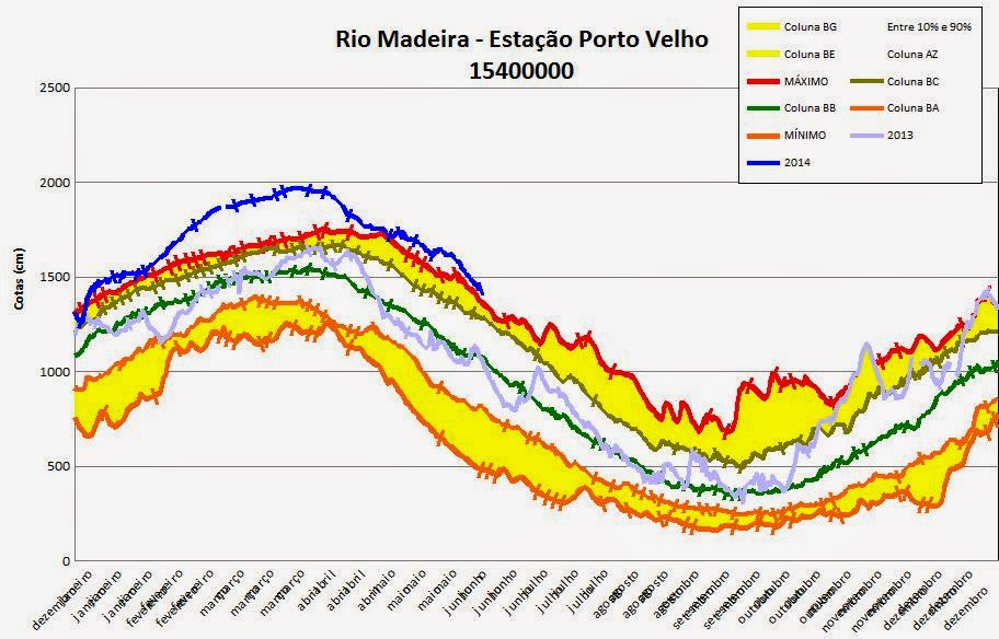 Por volta do meio dia de 30 de março de 2014, a régua da Companhia de Pesquisa de Recursos Minerais (CPRM) para medição do nível do rio Madeira em Porto Velho, marcava 19,74m, nível considerado recorde dos últimos 50 anos. A água inundou casas, desabrigou mais de 20 mil pessoas e fez com que fosse decretado Estado de Calamidade Pública em Rondônia. O fenômeno que assustou as populações dos municípios de Nova Mamoré, Guajará-Mirim e Porto Velho deve se repetir em 180 anos, segundo o Sistema de Proteção da Amazônia (Sipam).Os registros da elevação do rio Madeira são feitos pelo CPRM desde 1968 a partir de dois processos. De acordo Franco Buffon, engenheiro hidrólogo da companhia, o primeiro é a medição visual, feita duas vezes ao dia através de várias réguas distribuídas na margem do rio no Porto Organizado da capital.