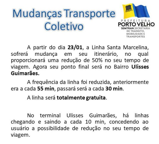 Isso será possível graças à mudança do itinerário. A linha começará na Comunidade Santa Marcelinha, vindo pela BR-364 até o terminal do Bairro Ulisses Guimarães e voltando ao local de partida. Do terminal os usuários poderão pegar outras linhas para chegar a seus destinos.