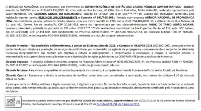 O Governo do Estado de Rondônia, por meio da Superintendência de Gestão dos Gastos Públicos Administrativos (SUGESP), rescindiu unilateralmente o Contrato nº 662/PGE-2021, firmado com a empresa Agência Nacional de Propaganda Ltda., sediada no Rio de Janeiro. A decisão passou a valer em 13 de outubro de 2025 e foi assinada  pela superintendente Semayra Gomes do Nascimento. A partir de agora, a PEN 6 passará a prestar os serviços de publicidade ao Governo.
