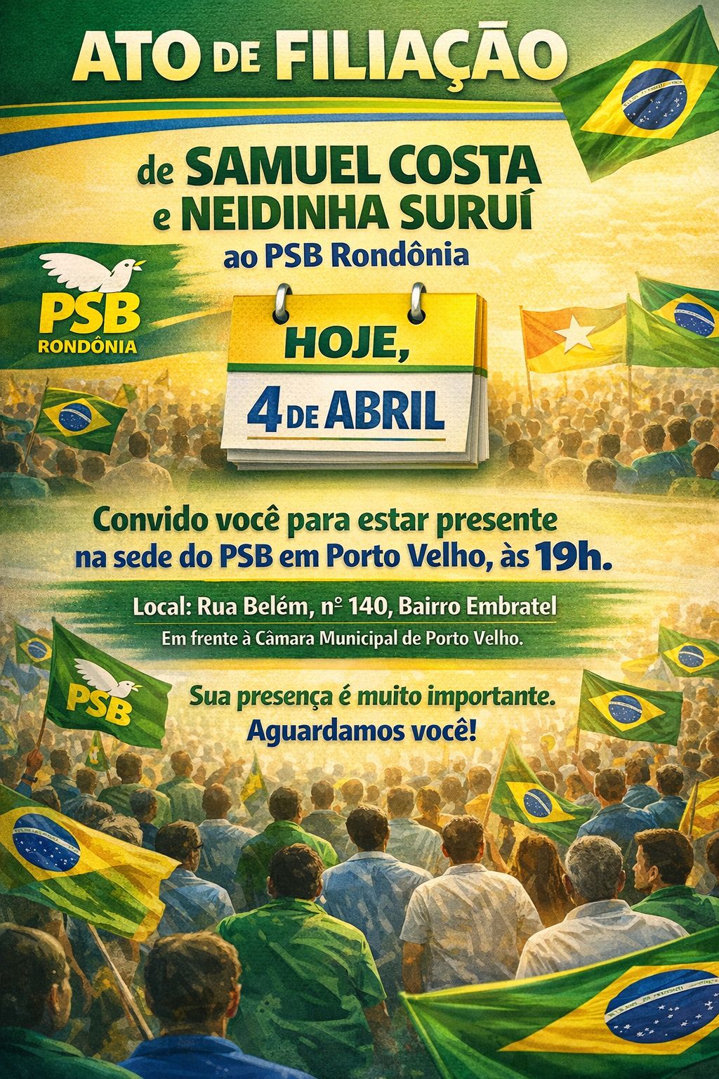 A poucas horas do prazo para mudança de partido, o pré-candidato ao governo de Rondônia, Samuel Costa, deixa a Rede Sustentabilidade e assina hoje, às 19 horas, ficha de filiação no PSB. Além dele, a pré-candidata ao Senado, Neidinha Suruí também migra para o partido do vice-presidente da República, Geraldo Alckmin.
