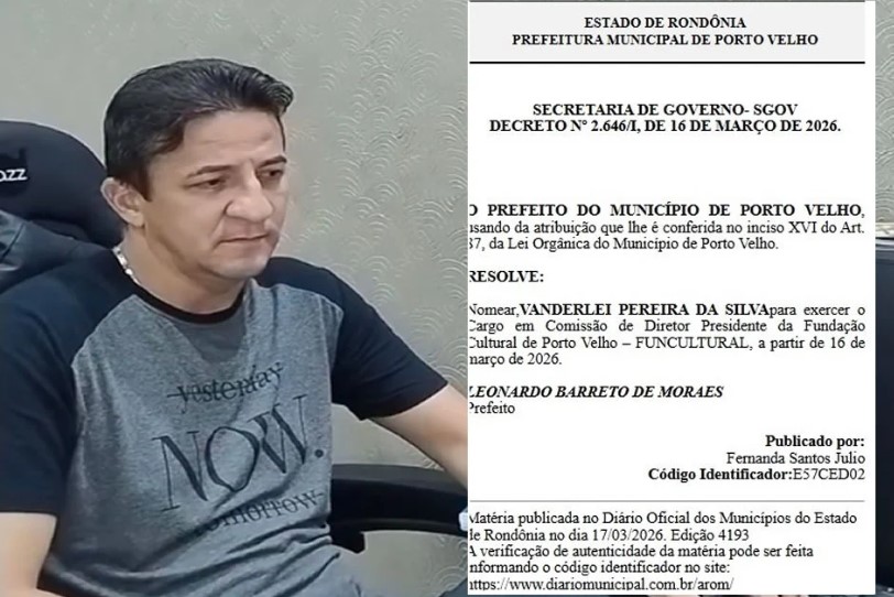 A Prefeitura de Porto Velho nomeou Vanderlei Pereira da Silva, conhecido como Vanderlei do “Maraca”, novo presidente da Fundação Cultural do município (Funcultural). A decisão foi publicada no Decreto nº 2.646/I, de 16 de março de 2026, com efeito imediato.