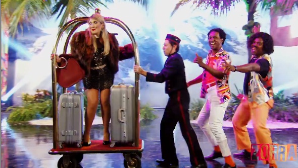 “Essa é a mistura do Brasil com a Suíça. Tem que ter grana para fugir da Justiça. A nova loira do Trust é rica de sonegar, é rica, só quer gastar”, canta um dos versos, enquanto Calabresa arregala os olhos à la Claudia Cruz.